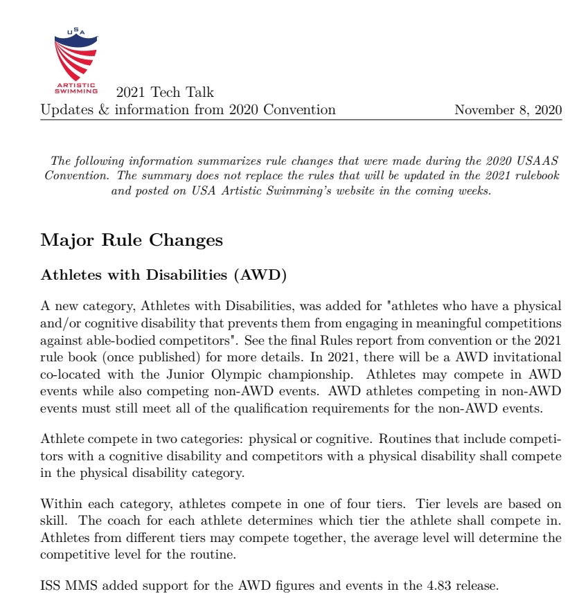 In 2015, the Artistic Swimming for Athletes with Disabilities (Artistic Swim AWD) formed as a non profit to start a grass roots movement to formally include athletes with disabilities in the sport of synchronized swimming, now called 'Artistic Swimming'. The handful of organizers knew this would be a long, arduous task to globally engage synchronized swim coaches and Federations from different countries, including the USA, to formally add a category with rules to include people with disabilities in competitions nationally and internationally.